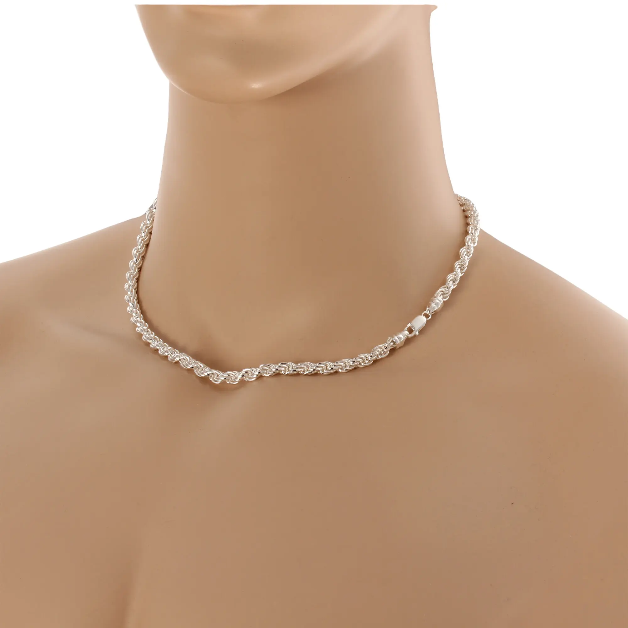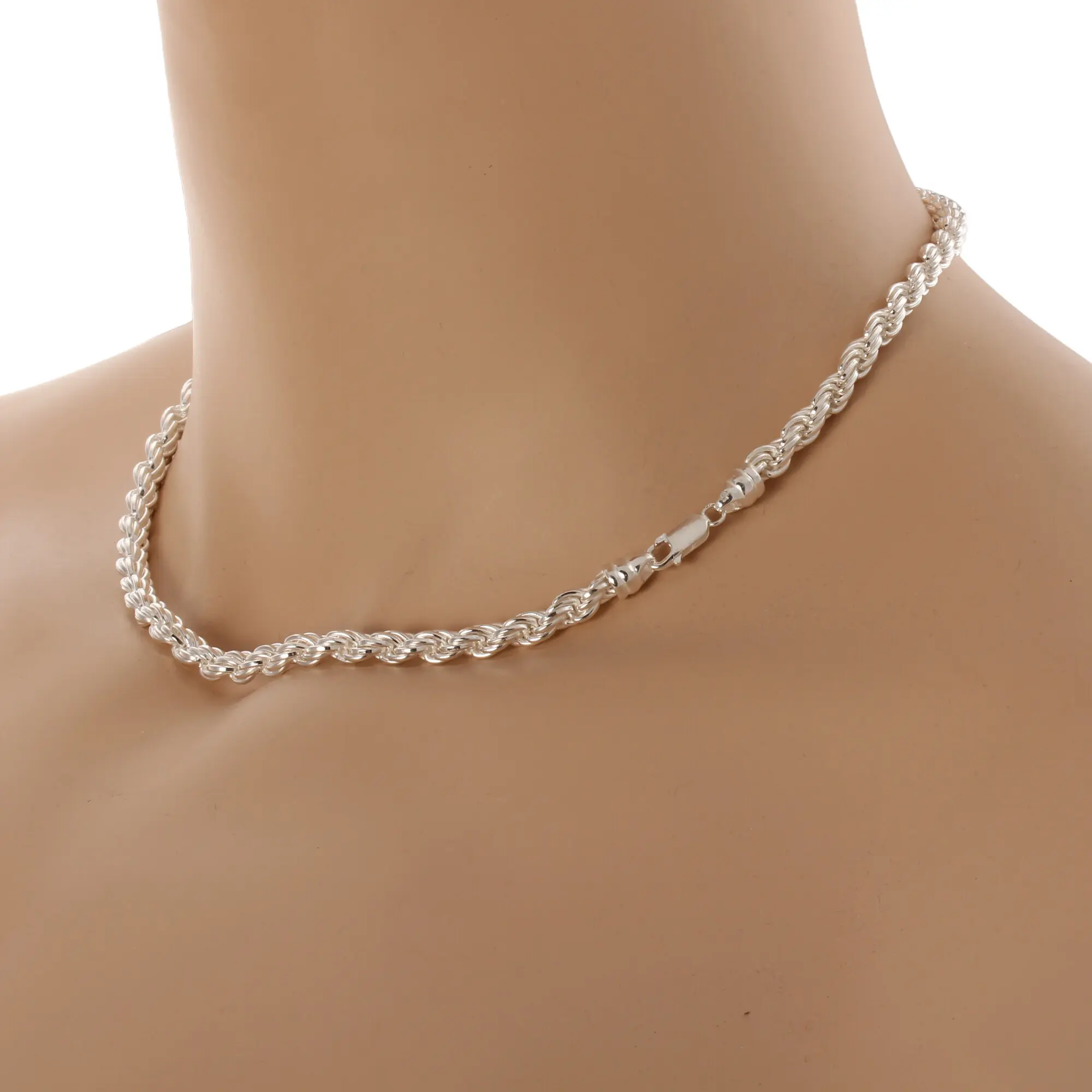 4.8mm wide solid sterling silver diamond cut unisex rope chain. Available in lengths up to 30 inches (76cm), the diamond cut edges give extra sparkle and shine to this popular chain design. Rope chain is becoming much more popular and the diamond cut rope chain is the preferred choice.