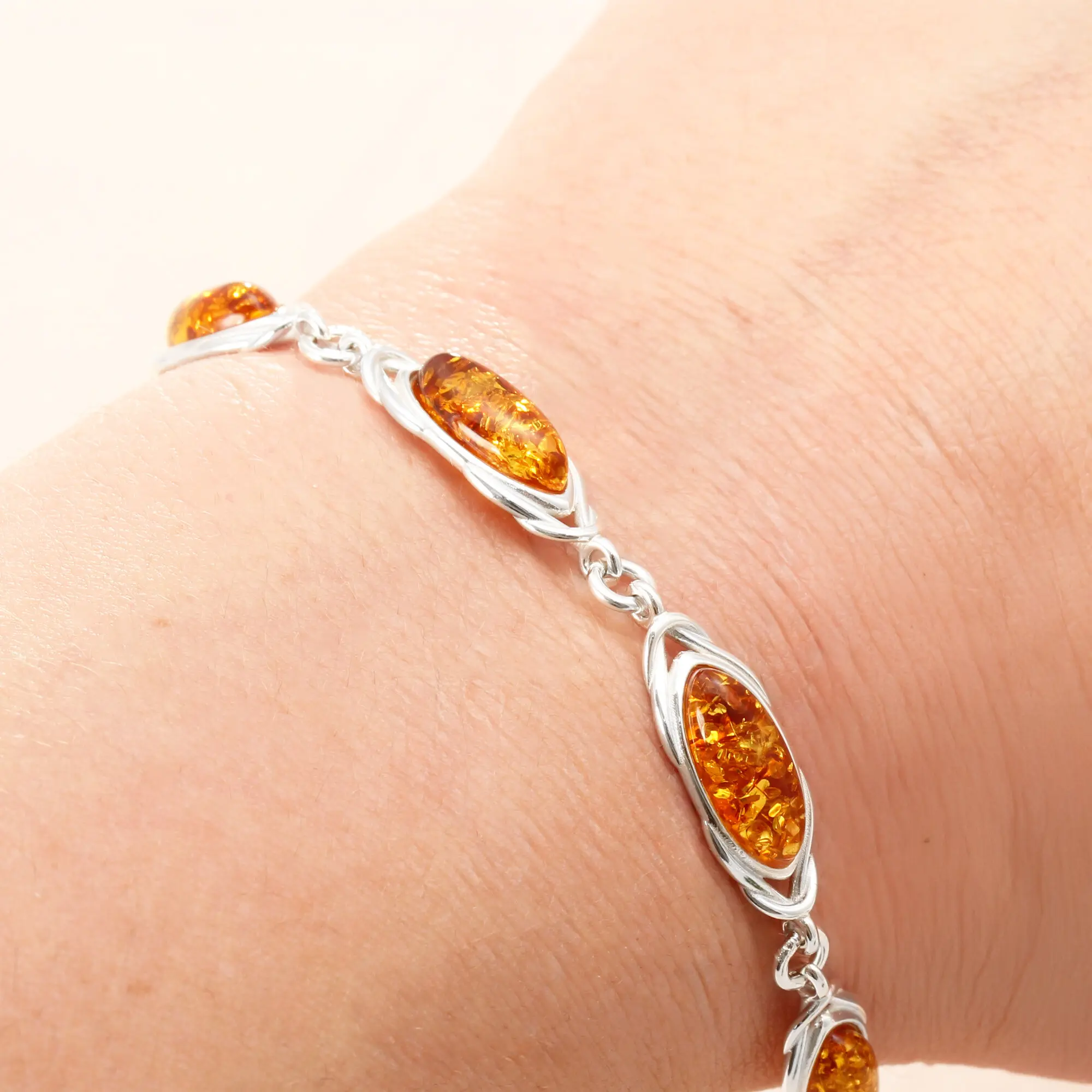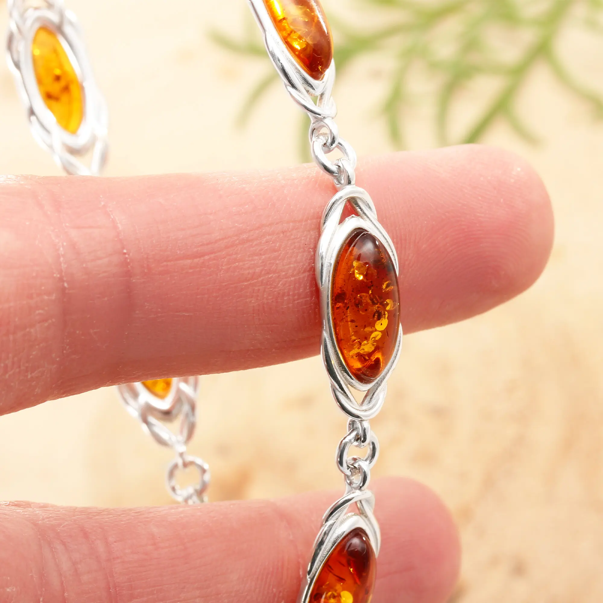 Solid sterling silver bracelet set with honey and green amber, each piece of amber has been cut into the classic trillion cabouchon cut and measures 9mm x 9mm. This exquisite bracelet is 7.25 inches in length and weighs 10.58 grams.
