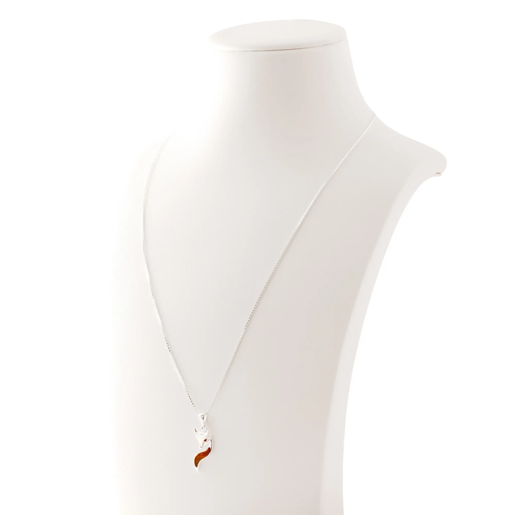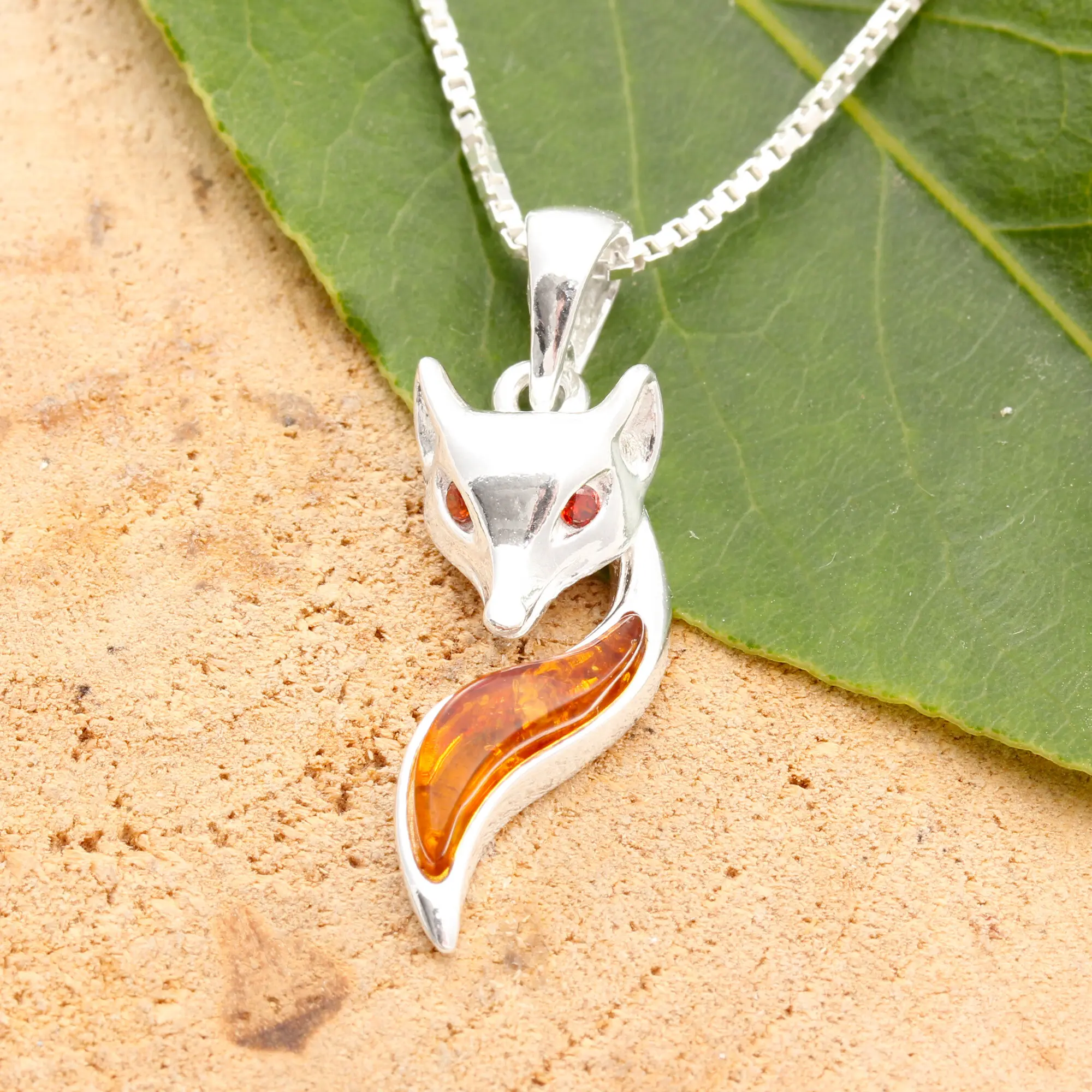 Cute little 925 sterling silver fox pendant set with a Baltic amber tail and red crystal eyes