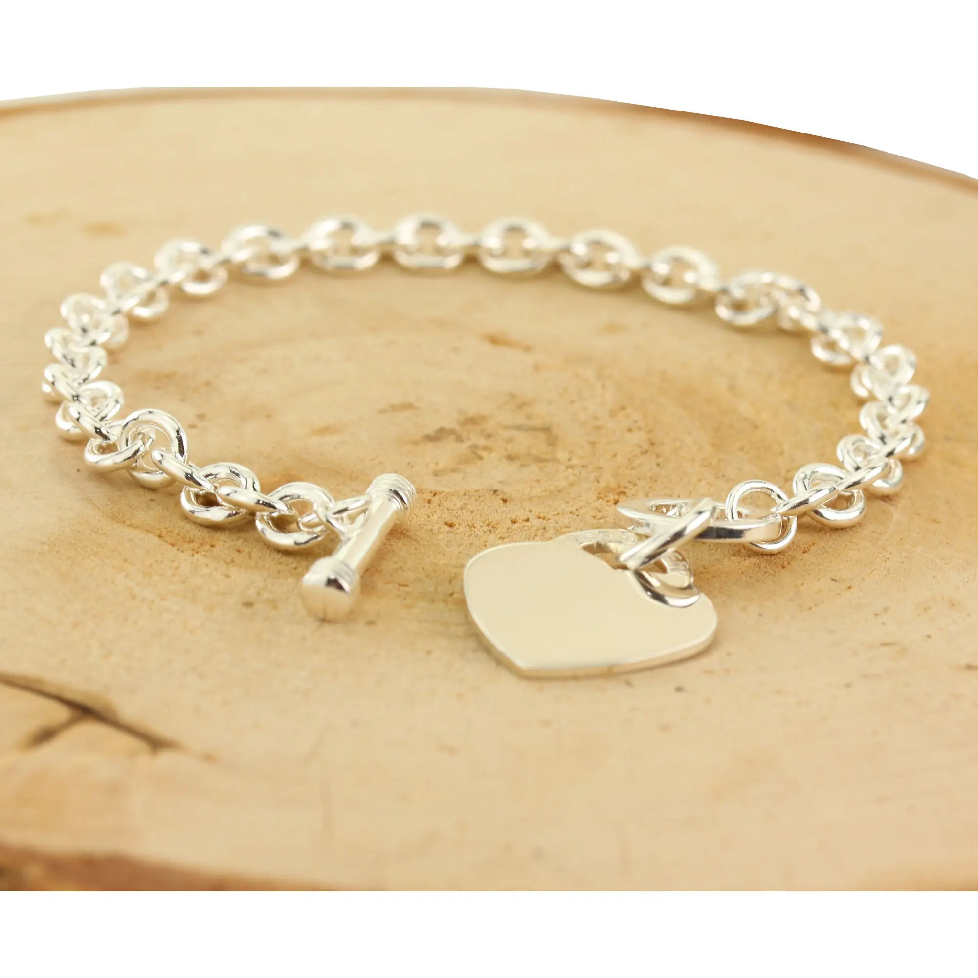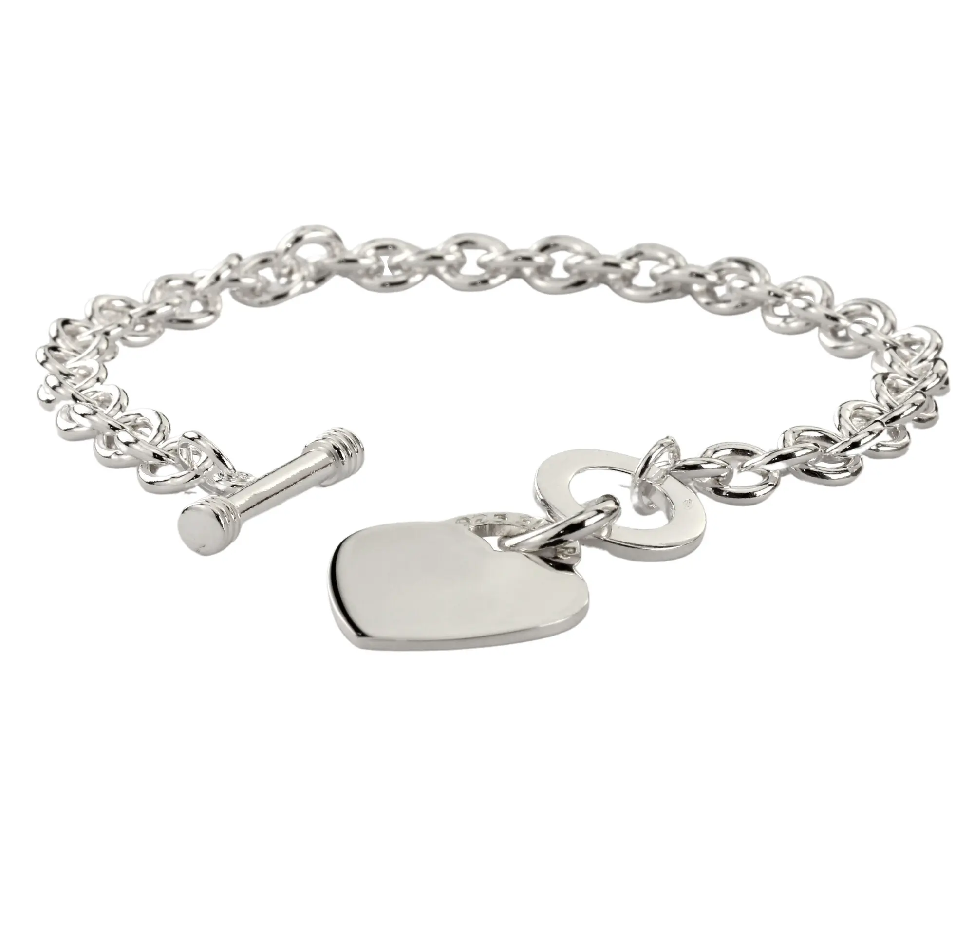 Solid sterling silver hallmarked heavy double heart T-bar toggle bracelet with two solid silver hearts. Available in 7.75" length - 46 grams (1.48 onces) 8.25" length - 50 grams (1.61 ounces)