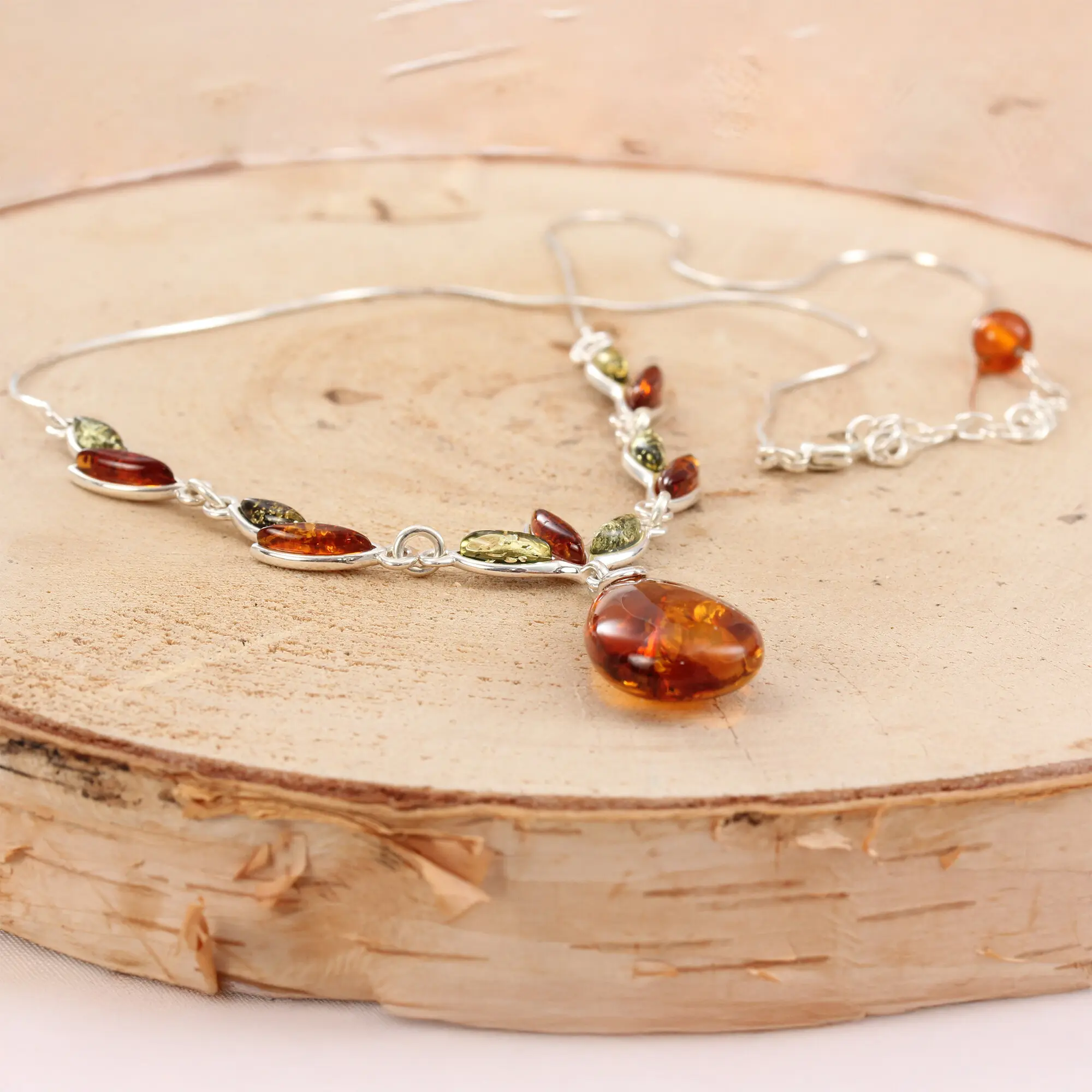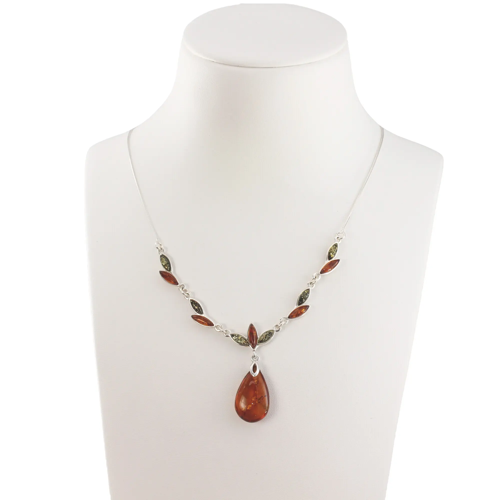 Green and honey marquise Baltic amber 925 sterling silver drop necklace