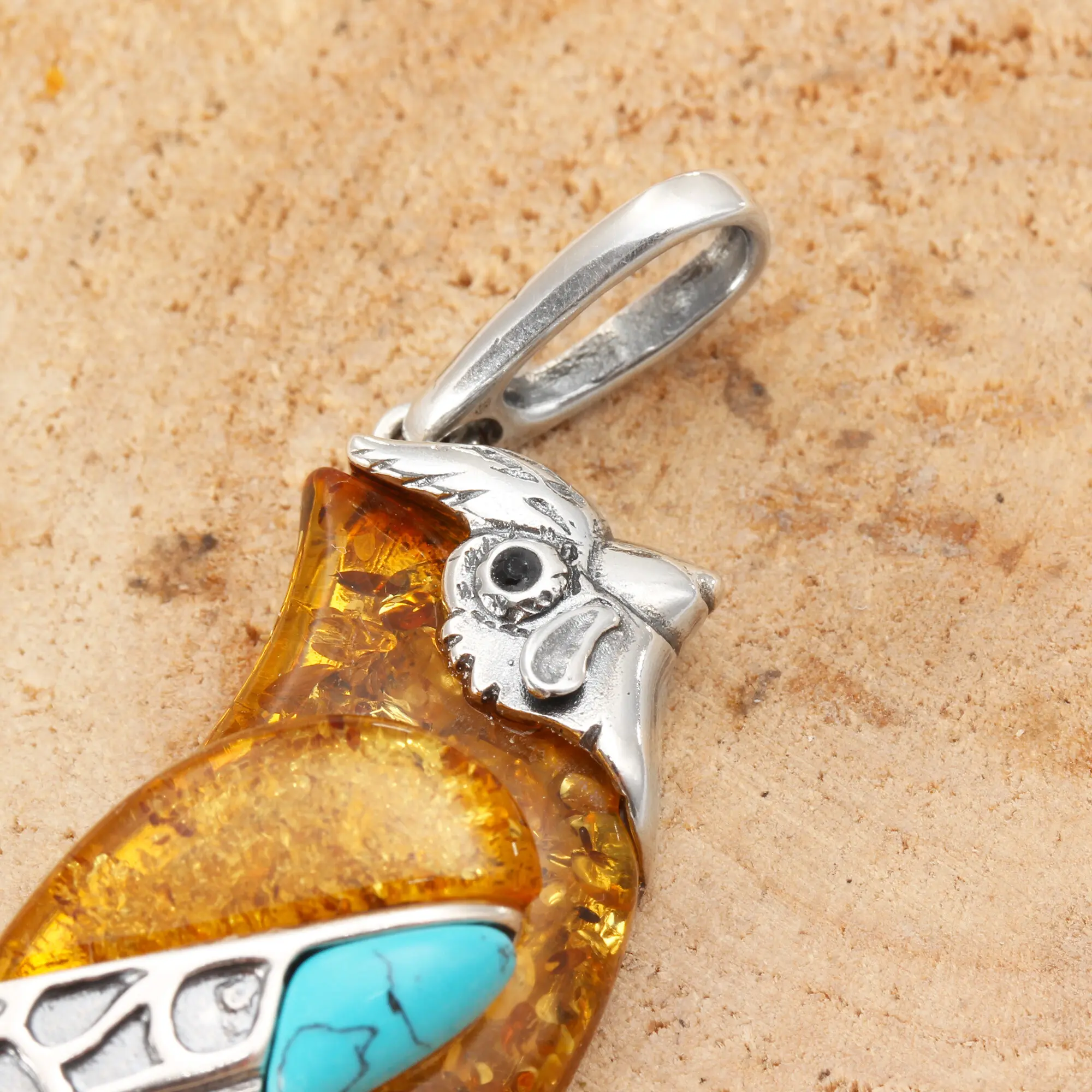 Medium sized Baltic amber and turquoise Kingfisher pendant
