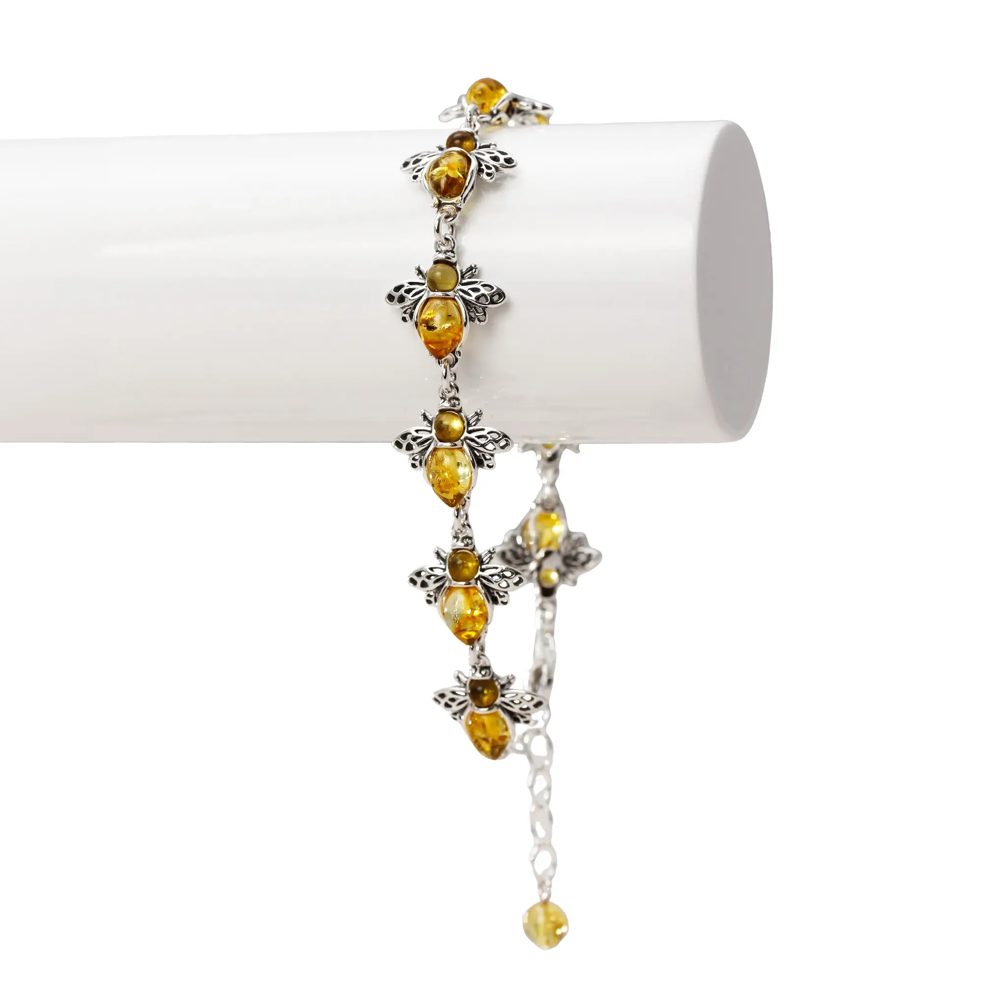 Sterling silver honey Baltic amber bee ring. Set with two honey Baltic amber stones for the body and head. The bee is lightly oxidised to enhance the detail of its body. The bee measures 14.9mm x 13.4mm. Comes available in various sizes.