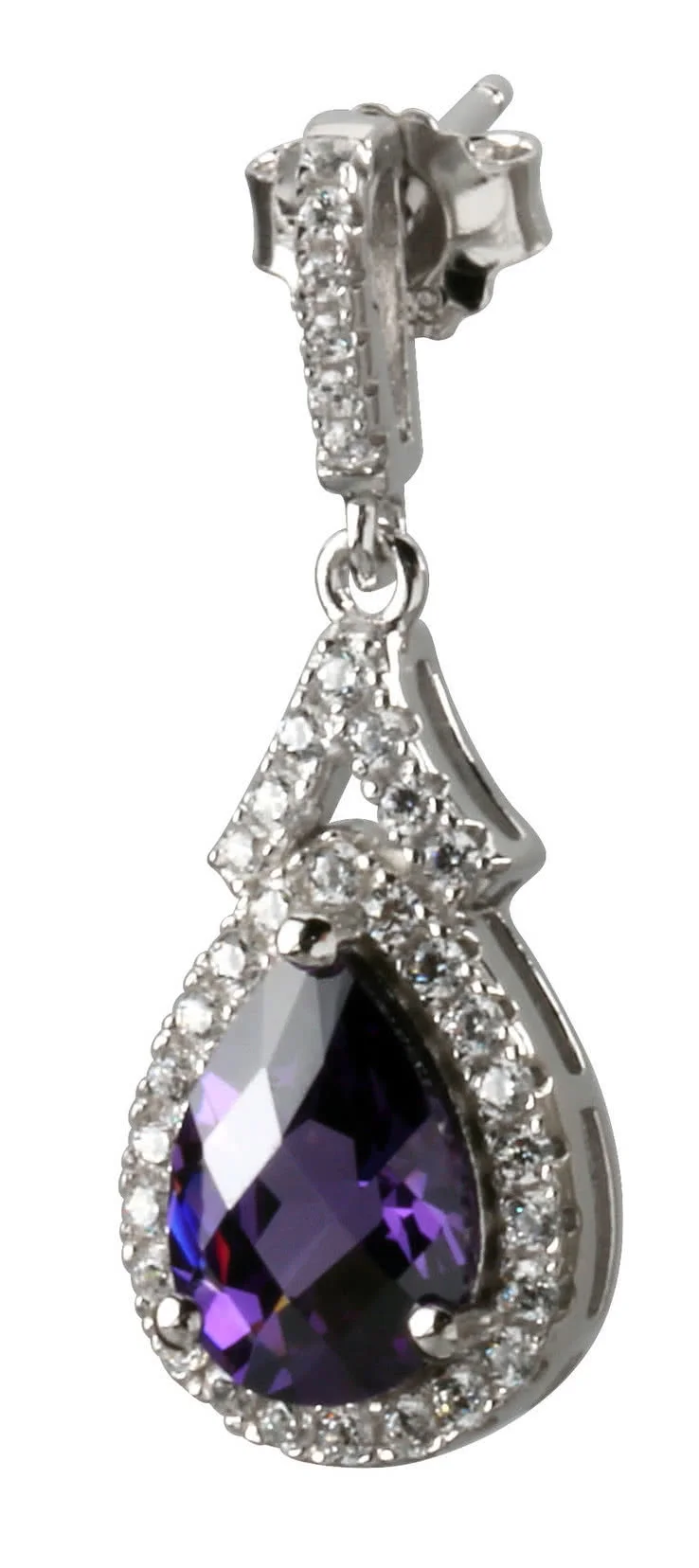 Stunning pair of sterling silver pear shaped purple cubic zirconia drop earrings, the stones measure 10mm x 7.5mm and the earring drop is 28mm. The rich purple stones are surrounded by clear CZ's simulating the finest diamonds, these really are special, finished with rhodium for a beautiful white gold look.