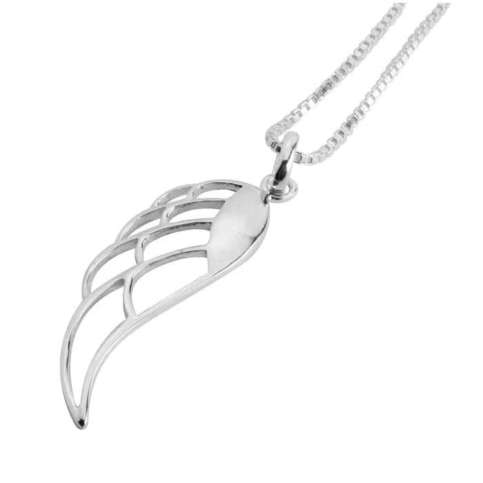 Solid sterling silver cubic zirconia set angel wing pendant. Stunning high quality finish set with sparkling cubic zirconia, 50mm drop including bale and an 18 inch silver box chain included.